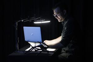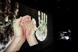 "The artist demonstrates the extent to which thinking is always bound to physicality by placing a wide variety of materials in relation to his own body, especially his hands. The hands can be seen as pointing and thinking organs, while Schmitt talks about historical, technological and social aspects of artificial 'intelligence'.” — Event program, Hartware MedienKunstVerein