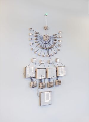 Kinetic sculpture. Maple, Paper, Elastic Cord, Electronics. 2020 413 ppm
